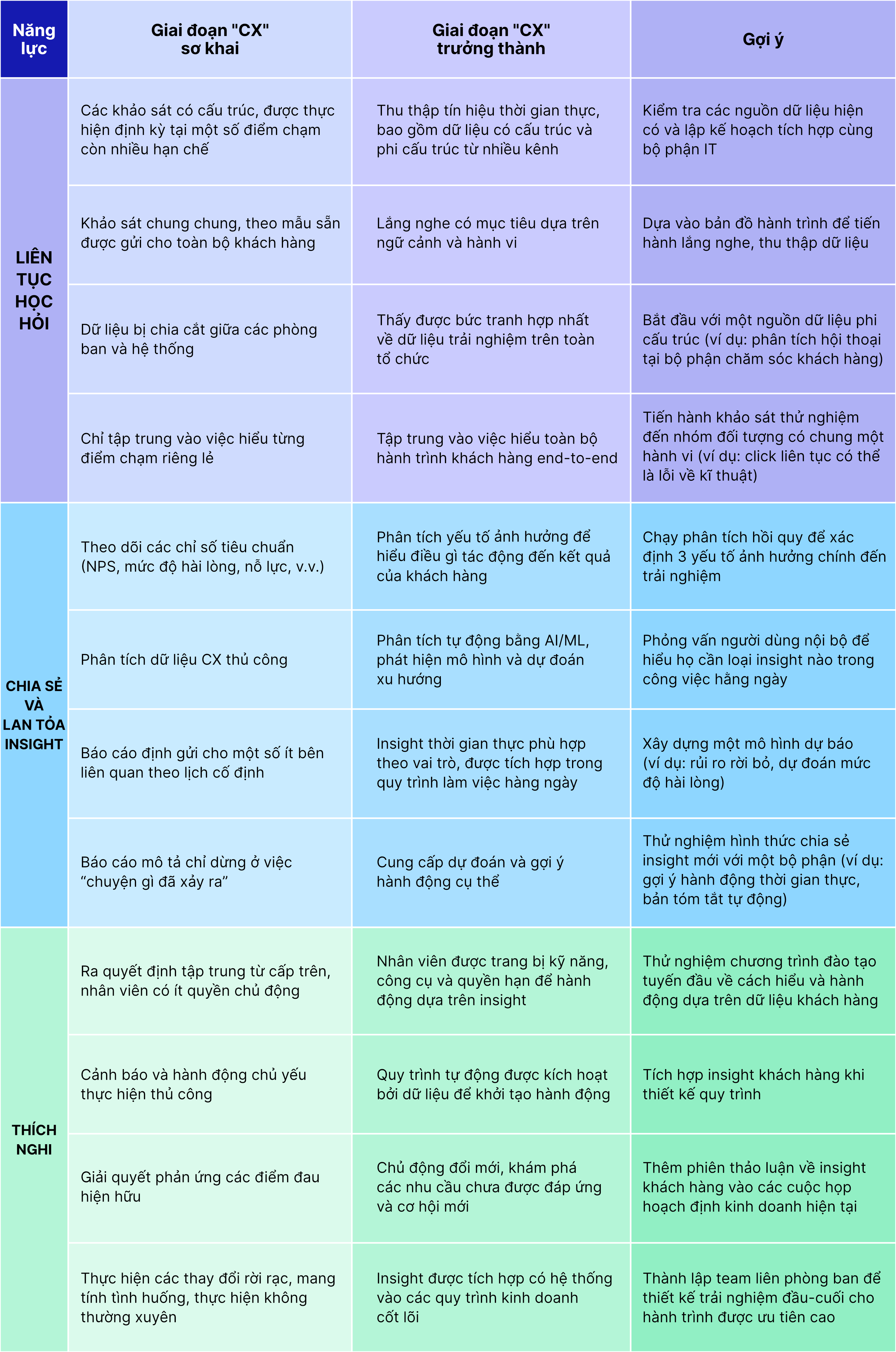 - Liên tục học hỏi: Các tổ chức có năng lực CX trưởng thành liên tục khai thác và diễn giải các thông tin, dữ liệu từ khách hàng, giúp họ phát hiện biến động thị trường, nhu cầu mới nổi và các mối đe dọa nhanh hơn đối thủ.