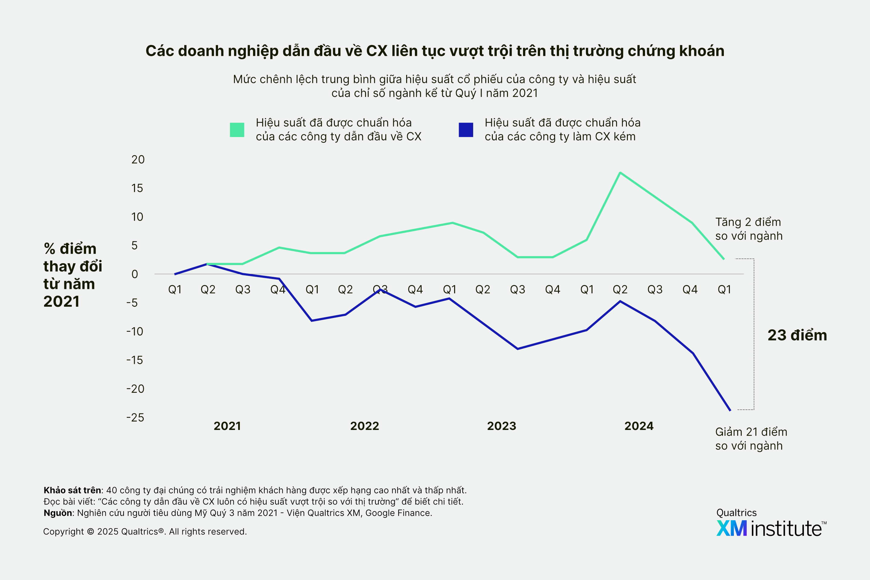 Một nghiên cứu theo dõi kéo dài bốn năm của Qualtrics XM Institute cho thấy các công ty được người tiêu dùng đánh giá cao nhất về trải nghiệm khách hàng (CX) vào năm 2021 liên tục có hiệu suất vượt trội so với mức trung bình ngành về tỷ suất sinh lời trên thị trường chứng khoán, trong khi các công ty có điểm CX thấp nhất tụt lại phía sau ngành của họ 21 điểm phần trăm. Khoảng cách hiệu suất giữa những doanh nghiệp dẫn đầu về CX và những doanh nghiệp tụt hậu về lợi nhuận cổ phiếu đã nới rộng lên 23 điểm phần trăm vào cuối năm 2024.